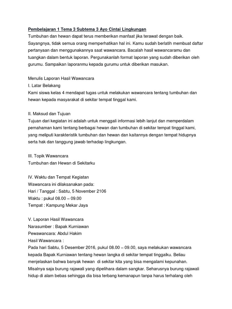Wawancara adalah salah satu cara untuk menggali informasi. Lakukan wawancara untuk mengetahui keragaman yang ada di lingkungan tempat tinggalmu. Membuat laporan dan kesimpulan wawancara. Laporan hasil wawancara sangat penting sebagai bukti autentik rekaman narasumber. Nur atiqah ima purnama sari julia pitri yanti neno bupatri sukrida andala yulianti nasrul azmi sandi herpando muhammad rafi … Fitriani,23 tahun (ibu rumah tangga) pewawancara : Berikut contoh laporan hasil wawancara: Kali ini saya sudah bersama bapak salah satu guru di sman 2 bangkalan. Setelah melakukan sesi wawancara, kita perlu menyusun laporan hasil wawancara supaya mudah dibaca. Kunci jawaban tema 7 kelas 5 halaman 57. Kunci jawaban tema 9 kelas 4 sd dan mi ini ditujukan kepada orang tua atau wali sebagai pedoman untuk mengoreksi hasil belajar anak. Bagaimana kereta kertas bisa bergerak? 16.30 wib tempat pelaksanaan :